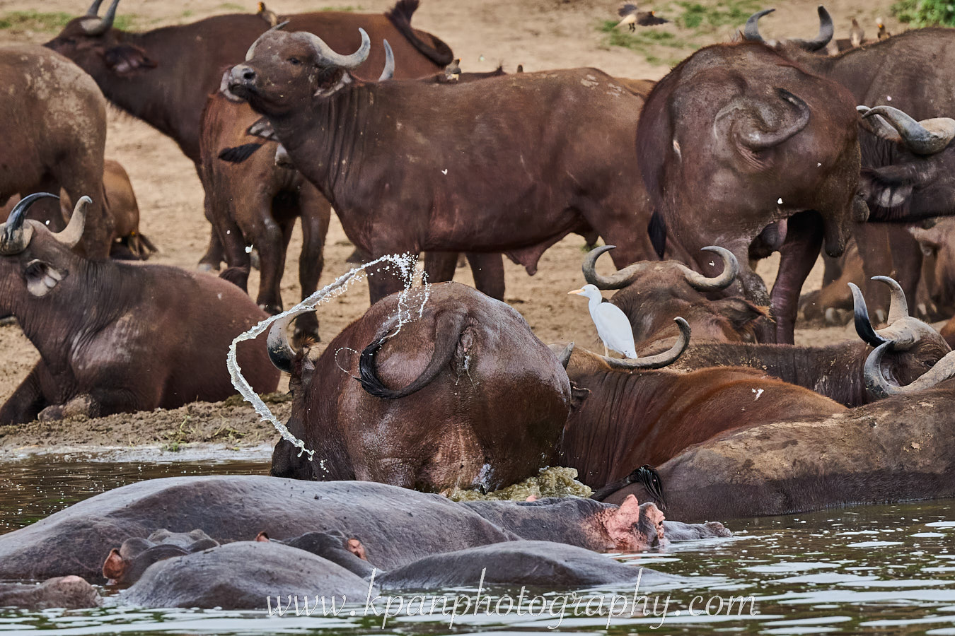 Cape buffalo and Egret at Lake George bank, Uganda.